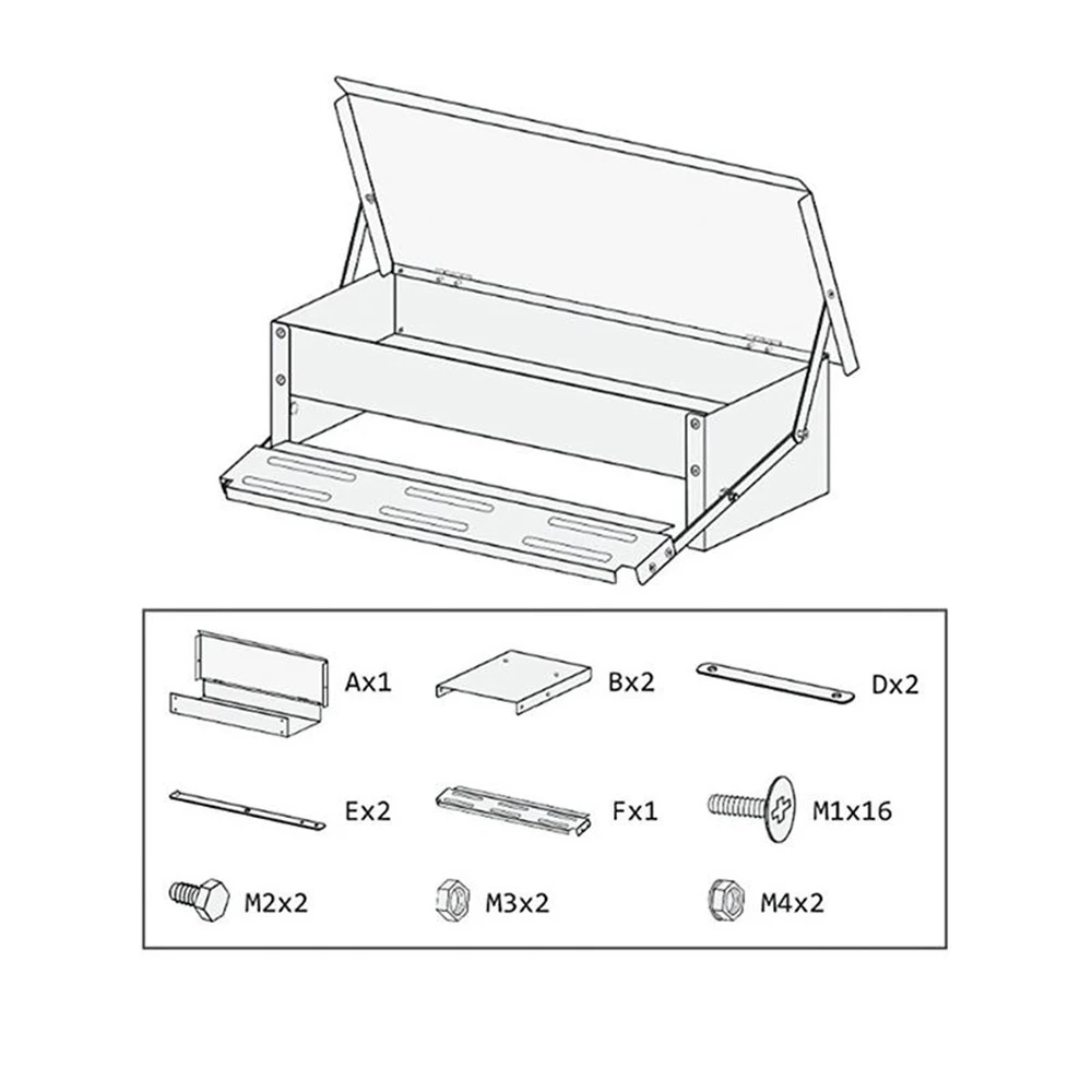 1. Sturdy Construction: Made from high-quality metal with a powder-coated finish, this poultry feeder is built to withstand harsh outdoor conditions, ensuring feed remains clean and fresh. Specification: Origin: Mainland China Material: Metal + Plastic Spraying + Iron Scope of application: Suitable for poultry such as chickens, ducks, geese, etc. Advantages: The top cover can be opened and closed at will, rainproof and moisture-proof, sturdy Feeder top cover size: 51*20cm Feeder internal capacity size: 48.5*10cm Feeder side size: 19*16.5cm Feeder pedal size: 50*13cm